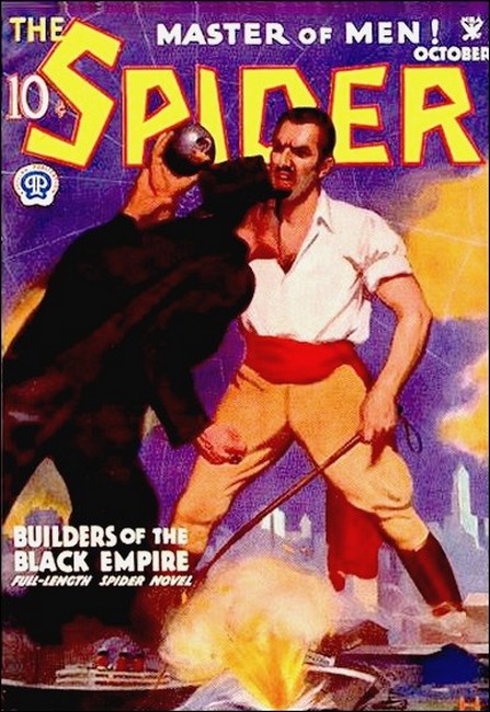 Ed's hand played around on the desk top behind him, felt an inkwell. Gomez and Sardo couldn't see what he was doing because his body screened the inkwell. He gripped it a moment in his long, powerful fingers, and flipped it from the glass top of the desk. It rose in a swift arc, straight for Gomez' head, spattering ink in a far-flung spray. For an instant, Gomez and Sardo were surprised, and in that second Ed went backward, feet in the air, and did a back-flip over the desk. He smashed into the swivel-chair behind the desk, pulled it over with him to the floor just as the automatics of both the two captors spatted furiously. Slugs crashed into the wall over his head, accompanied by oaths from the two men.