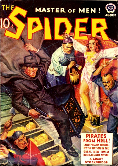 He stopped, his eyes widening in amazement. Coming from around the corner, there appeared the gentleman in the Prince Albert, with the moustache and the goatee. He was carrying a gold-knobbed cane now, and he was hurrying. At sight of the group around Griscomb's body, he waved his cane and shouted, "Ah! I see zat you 'ave catch thee criminal! Bueno!"