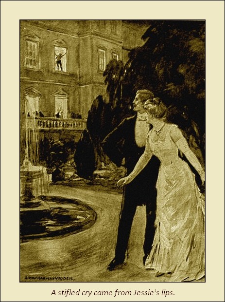 A voice came from somewhere, a voice asking somebody also in a whisper to put the lights out. This command was repeated presently in a hurried way, and Jessie realised that the voice was addressing her. Without a minute's hesitation she crossed over to the door and flicked out the lights. Well, the adventure was beginning now in real earnest, Jessie told herself. The voices whispered something further, and then in the corridor Jessie saw something that rooted her to the spot. In perfect darkness herself, she could look boldly out into the light beyond. She saw the figure of a man half led and half carried between two women—one of them being in evening dress. The man's face was as white as death. He was either very ill or very near to death, Jessie could see; his eyes were closed, and he dragged his limbs after him like one in the last stage of paralysis. One of the ladies in evening dress was elderly, her hair quite gray; the other was young and handsome, with a commanding presence. On her hair she wore a tiara of diamonds, only usually affected by those of royal blood. She looked every inch a queen, Jessie thought, as with her strong gleaming arms she hurried the stricken man along. And yet there was a furtive air about the pair that Jessie did not understand at all.