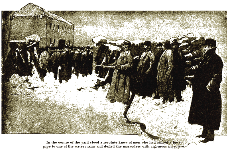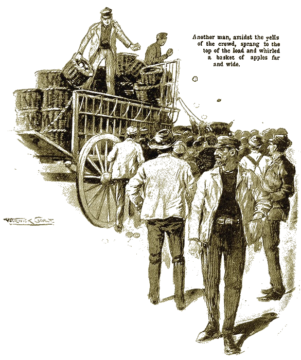 Presently curiosity was followed by a sullen resentment. Who were these men that they should be allowed to fatten on public misfortune? These things ought to have been given away if only on the ground of mere public policy. Through the crush came a waggon-load of baskets and boxes. A determined-looking mechanic stopped the horses whilst another man, amidst the yells of the crowd sprang to the top of the load and whirled a basket of apples far and wide.