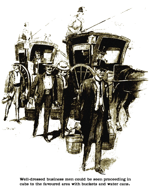 By midday business was at a standstill. There was not a water cart to be seen from Kensington to the Mansion House. Every cart and tank that could be raked together had been despatched into the New River and Kent Water area with instructions to convey a supply as speedily as possible to the congested districts East and South-east of the Thames. By lunch time the City presented a strange spectacle. Well-dressed business men could be seen proceeding in cabs to the favoured area with buckets and water cans with the avowed object of taking a supply forthwith. Cabmen were commanding their own prices.