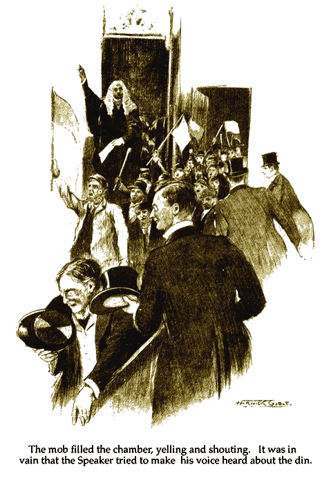 The Speaker looked up sharply. A stinging reproof was on the tip of his tongue. He had scarcely uttered a word, before, as if by magic, the green benches were swarming with the mob. It filled the chamber, yelling and shouting. It was in vain that the Speaker tried to make his voice heard above the din.