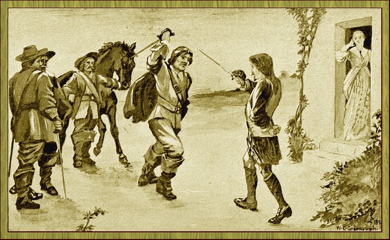 Now, by ill fortune, the time came when, what with gaming and pleasuring, I was a beggared man, and I bethought me of the Scot’s offer. I had liked the man well, and I considered how it would be no ill thing to abide in that country till I should find some means of bettering my affairs. So I took ship and came to the town of Ayr, from which ’twas but a day’s ride to the house of my friend. ’Twas in midsummer when I landed, and the place looked not so bare as I had feared, as I rode along between green meadows to my destination. There I found Quentin Kennedy, somewhat grown old and more full in flesh than I remembered him in the past. He had been a tall, black-avised man when I first knew him; now he was grizzled,—whether from hard living or the harshness of northern weather I know not,—and heavier than a man of action is wont to be. He greeted me most hospitably, putting his house at my bidding, and swearing that I should abide and keep him company and go no more back to the South.