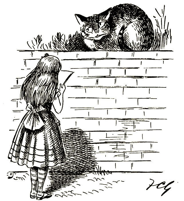 "It never has, you know," interrupted the Cheshire Cat rudely, "but in its leisure moments" (Alice thought it must have a good many of them) "when it isn't playing with a gutta-percha ball it unravels the groundwork of what people believe—or don't believe, I forget which."